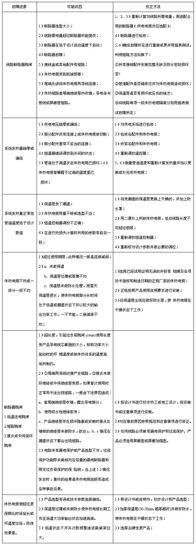 電伴熱帶(伴熱電纜)故障原因分析及維修對應(yīng)表